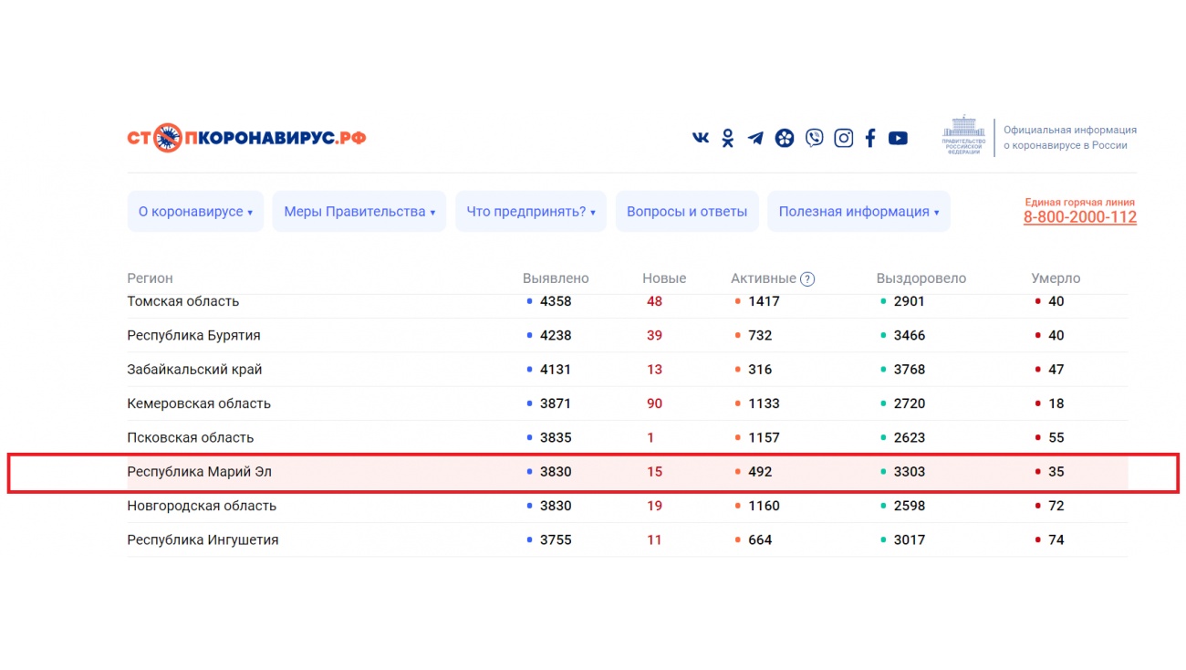 За последние сутки в России число подтверждённых случаев коронавирусной инфекции COVID-19 составило 8 726 в 85 регионах. В Республике Марий Эл выявлено 42 новых заболевших коронавирусом, 51 пациент выздоровел, 1 — умер, сообщили в Информационном центре по мониторингу ситуации с коронавирусом
