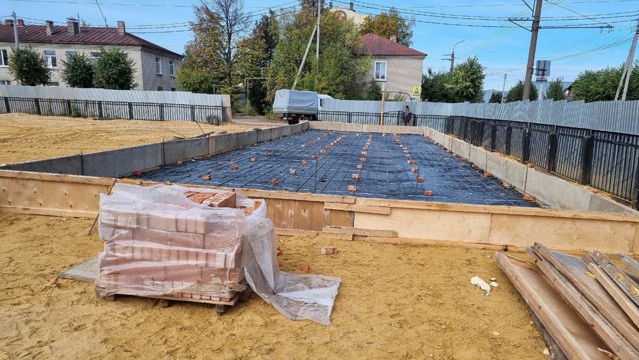 На территории Дворца молодёжи работы тоже в самом разгаре. Укладка дренажной системы уже проведена, засыпан щебень под основание футбольного поля, забетонировано основание...
