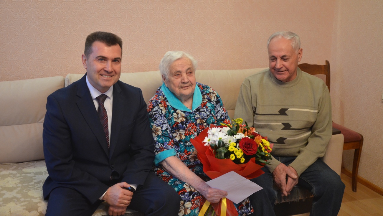 Представители администрации города вручили имениннице персональное поздравление от имени Президента Российской Федерации Владимира Путина, памятные подарки и цветы.